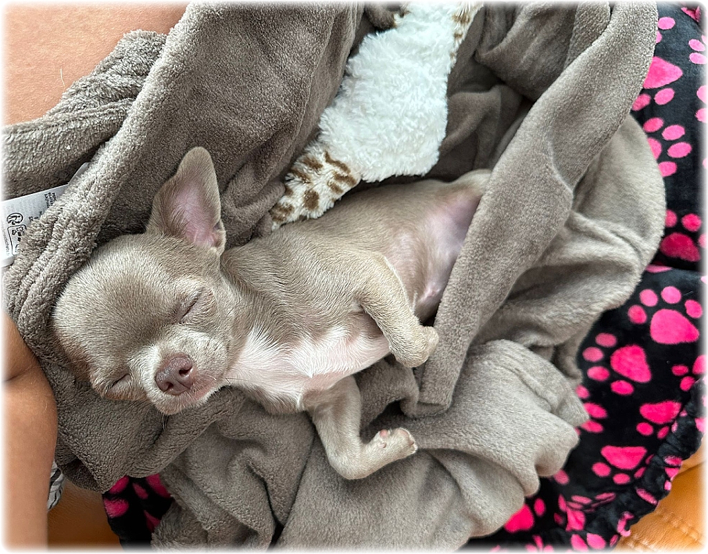 Dnes odešla do nového domova temperamentní Cherynka. Výbavičku jsem jí balila s těžkým srdcem, vzhledem k tomu, že je to drobnější fenka, nespěchala jsem s její nabídkou a termínem odběru. Je zvláštní, jak si člověk za pár dní "navíc" na takové malé stvoření zvykne. Co mě těší je fakt, že má skvělé majitele a také dvě čivaví kámošky. Děkuji novým majitelům za zaslání fotek z nového domova, doufám, že budou s tím malým ďáblíkem spokojeni.