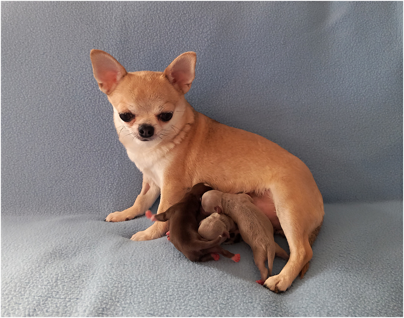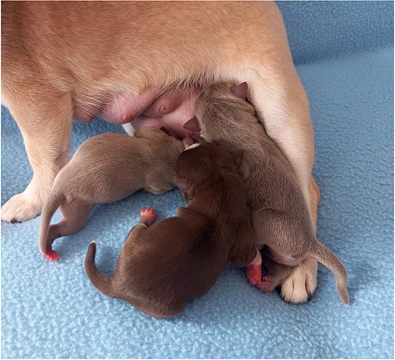 Štěňátka jsou čilá a dobře prospívají. Iriska je fenka s výborným mateřských chováním a o štěňátka se vzorně stará.