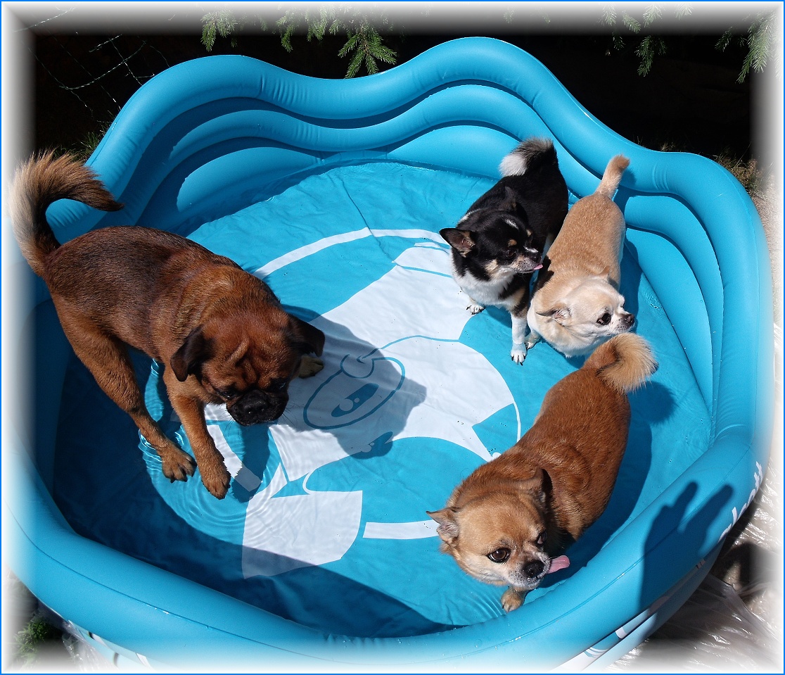 Od paní Ivy V. - majitelky tří pejsků z mé CHS jsem dostala fotku zobrazující aktivity pejsků v horkých letních dnech. Beník (11,5 let), Coddy (9 let) a Darney (8 let) se ochlazují ve svém vlastním bazénu :-). Společnost jim dělá rodinný kamarád brabantík.