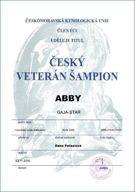 Za předvedení a trojnásobné ohodnocení rozhodčím pro exterier ve třídě veteránů s výsledkem V1, byl Abby přidělen titul ČESKÝ VETERÁN ŠAMPION.
